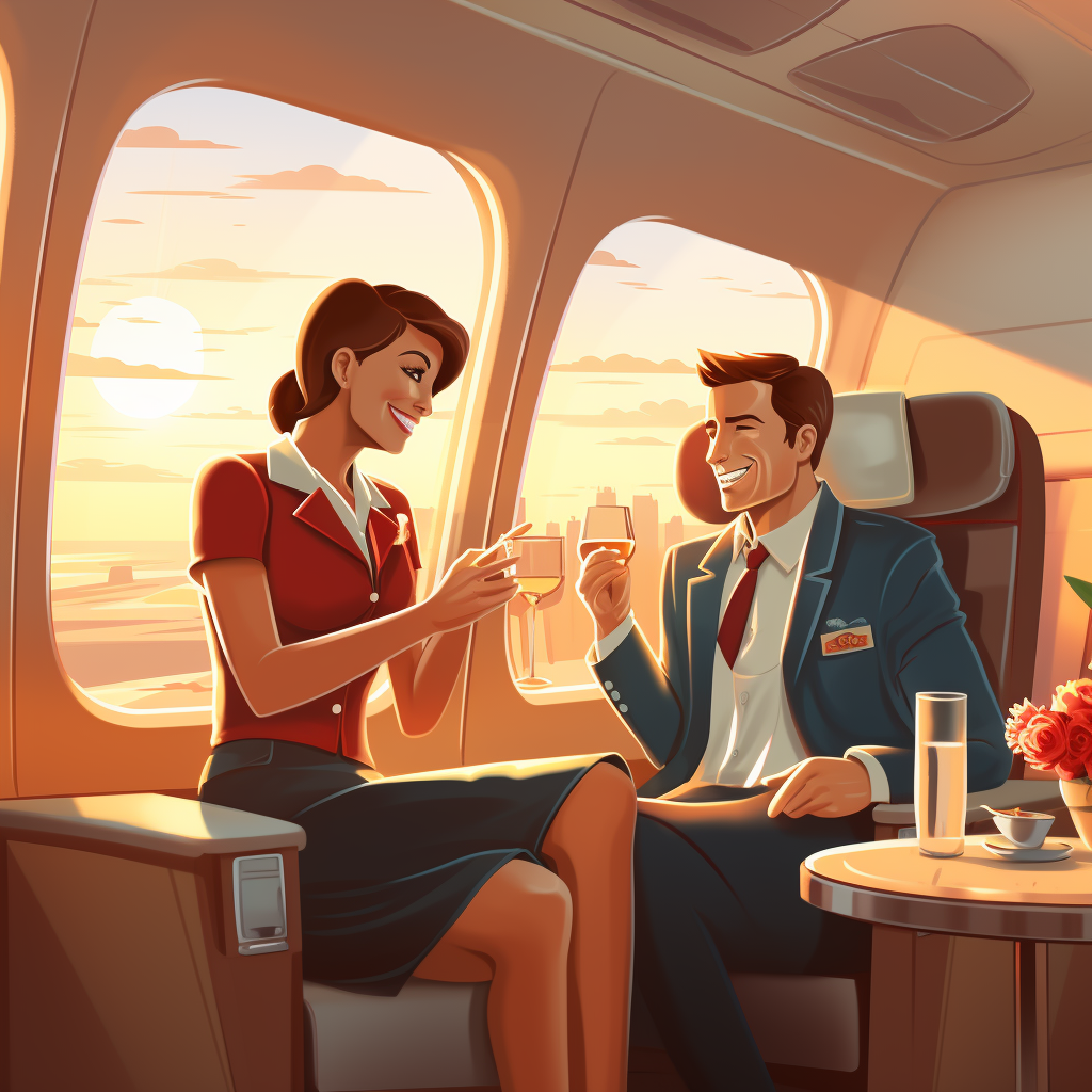 비행기 기내, 아늑한 좌석에서 Alex는 창 밖으로 흐르는 구름을 바라보며 깊게 생각에 잠겨 있었다. 그의 생각을 깨우는 것은 스튜어디스의 부드러운 목소리였다. "음료는 어떤 것을 드시겠어요?" Alex는 그녀에게 친절한 미소로 답했다. 그들 사이에는 짧지만 따뜻한 대화가 펼쳐졌다. Alex는 처음 타본 항공사였기에 기내 서비스에 대한 정보를 물었고, 스튜어디스는 친절하게 설명해 주었다. 그 대화 속에서 Alex는 이 항공사의 서비스에 만족하는 것 같았다.