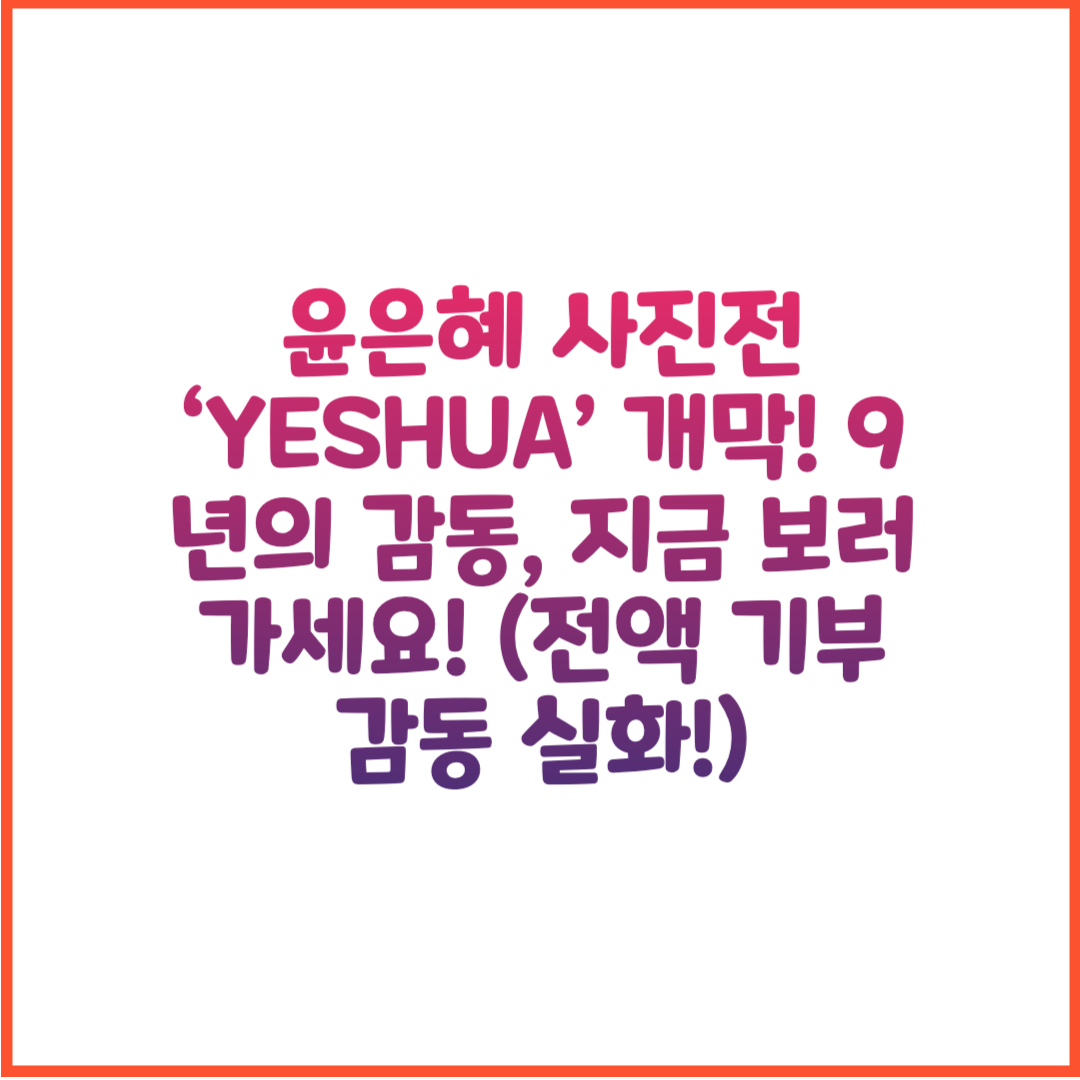 윤은혜의 사진집 YESHUA 전시회는 단순한 연예인의 전시가 아닌, 긴 시간 동안 준비한 진정성 있는 예술 프로젝트입니다. 그녀의 진심이 담긴 사진들과 메시지를 통해 많은 분들이 감동을 받고, 전시회의 수익금이 의미 있게 사용되기를 기대합니다. 지금이 바로 윤은혜의 진심을 만나볼 수 있는 소중한 시간입니다. 전시회에 대한 자세한 일정이 공개되면 미리 확인하여 꼭 방문해보시기 바랍니다.