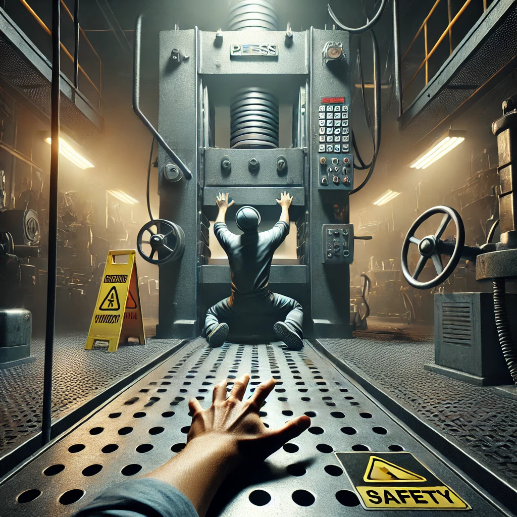 인천의 금속 가공 공장에서, 프레스기를 조작하던 중 근로자의 손이 기계에 끼이는 사고가 발생했습니다. 비상 정지장치가 제대로 작동하지 않았고, 안전 커버도 임의로 제거된 상태였습니다.