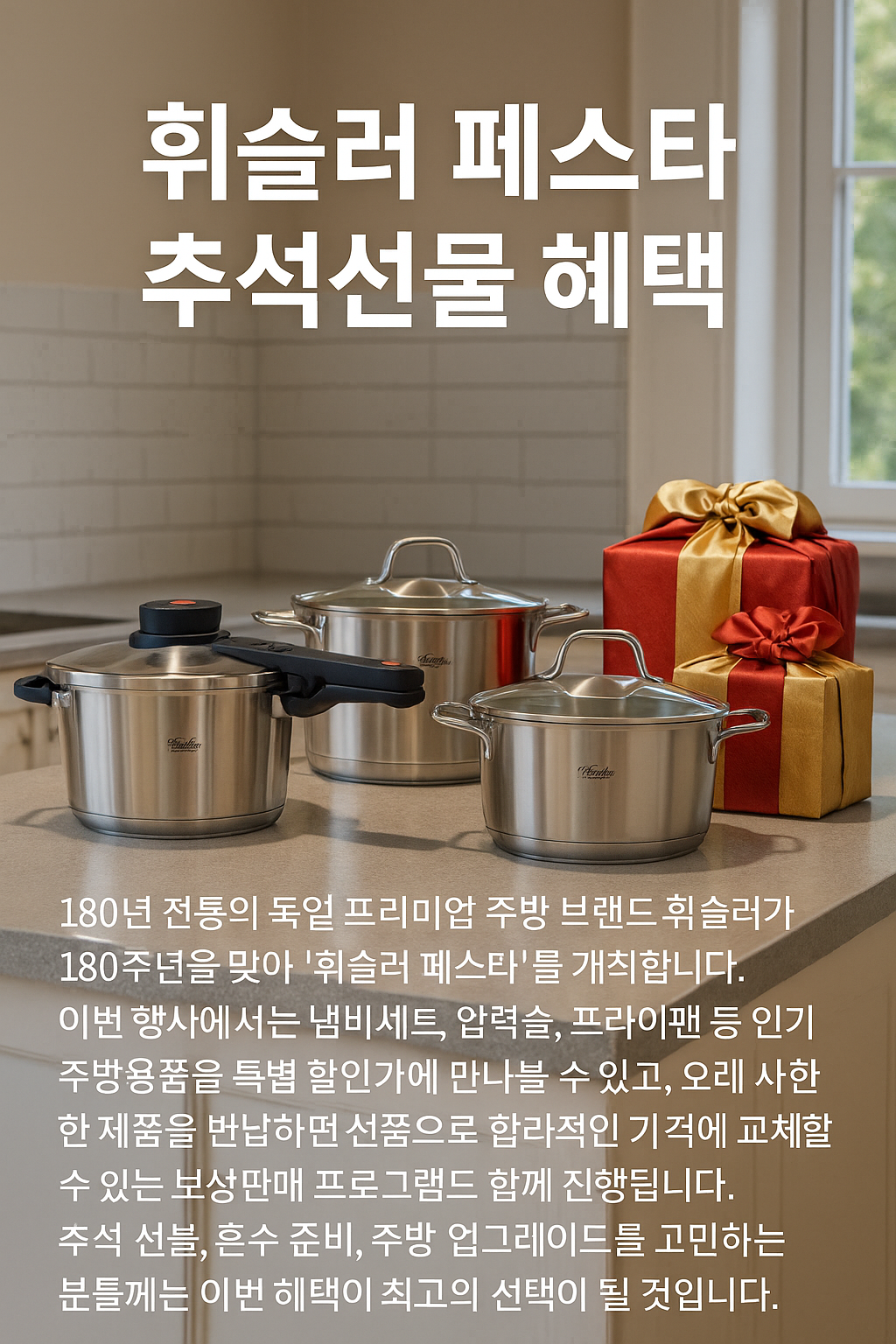 180년 전통을 자랑하는 독일 프리미엄 주방 브랜드 휘슬러가 180주년을 맞아 ‘휘슬러 페스타’를 개최합니다. 이번 행사에서는 냄비세트, 압력솥, 프라이팬 등 인기 주방용품을 특별 할인가에 만나볼 수 있고, 오래 사용한 제품을 반납하면 신제품으로 합리적인 가격에 교체할 수 있는 보상판매 프로그램도 함께 진행됩니다. 추석 선물, 혼수 준비, 주방 업그레이드를 고민하는 분들께는 이번 혜택이 최고의 선택이 될 것입니다.