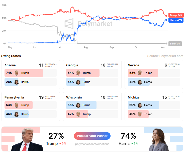 2024 미국 대선 폴리마켓 예측: 트럼프 vs 해리스 승률 대결