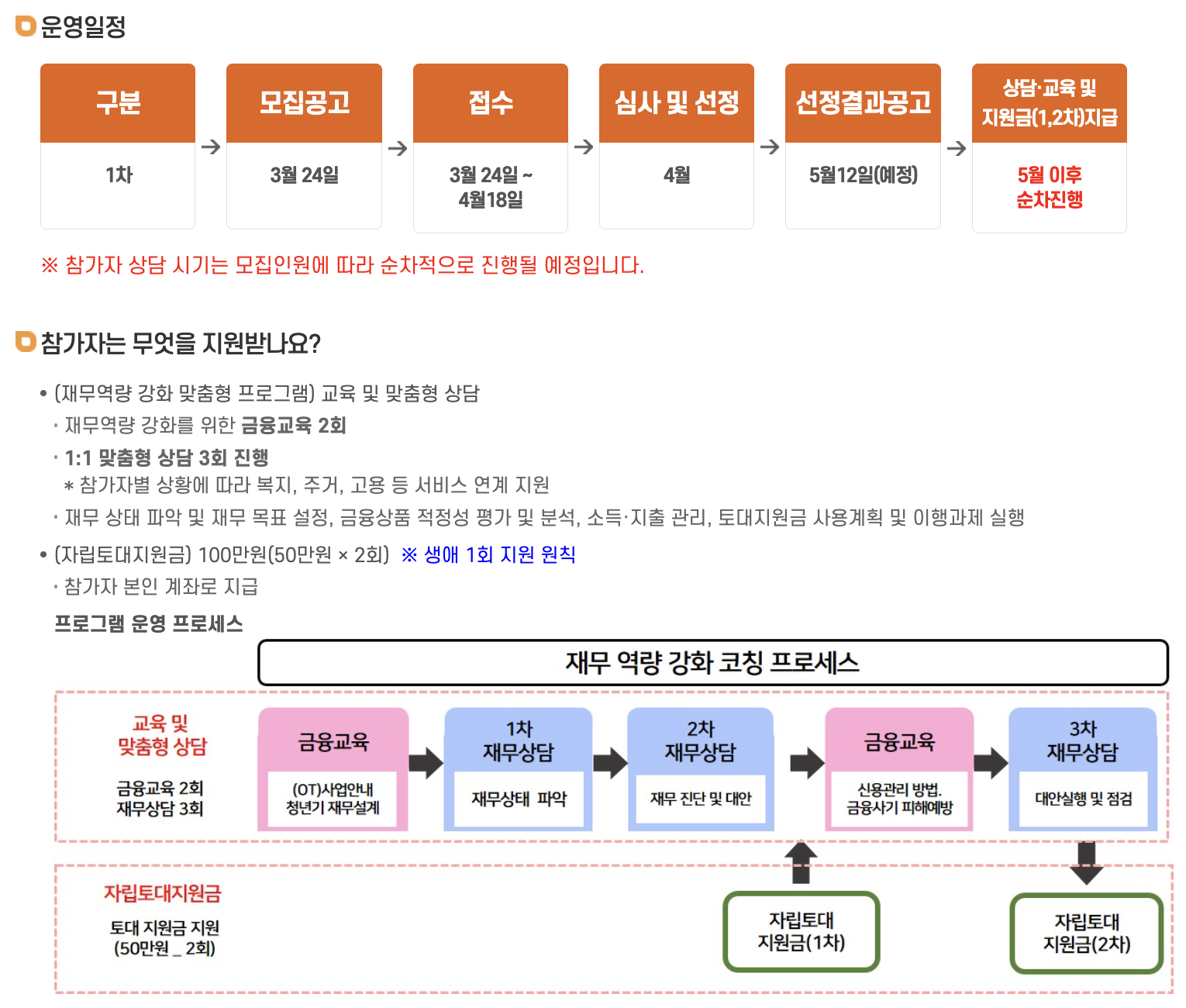참여자는 생애 1회만 지원 가능하며, 신청 조건을 충족할 경우 선정 후 본인의 계좌로 총 2회에 걸쳐 자금을 지원받을 수 있습니다.