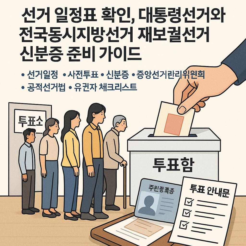다가오는 대한민국 선거 일정을 정리했습니다. 대통령선거, 국회의원 총선거, 전국동시지방선거, 재보궐선거의 주요 일정과 사전투표 방법, 신분증 준비, 중앙선거관리위원회 공고 및 공직선거법 규정까지 유권자가 반드시 알아야 할 핵심 정보를 한눈에 확인할 수 있습니다.