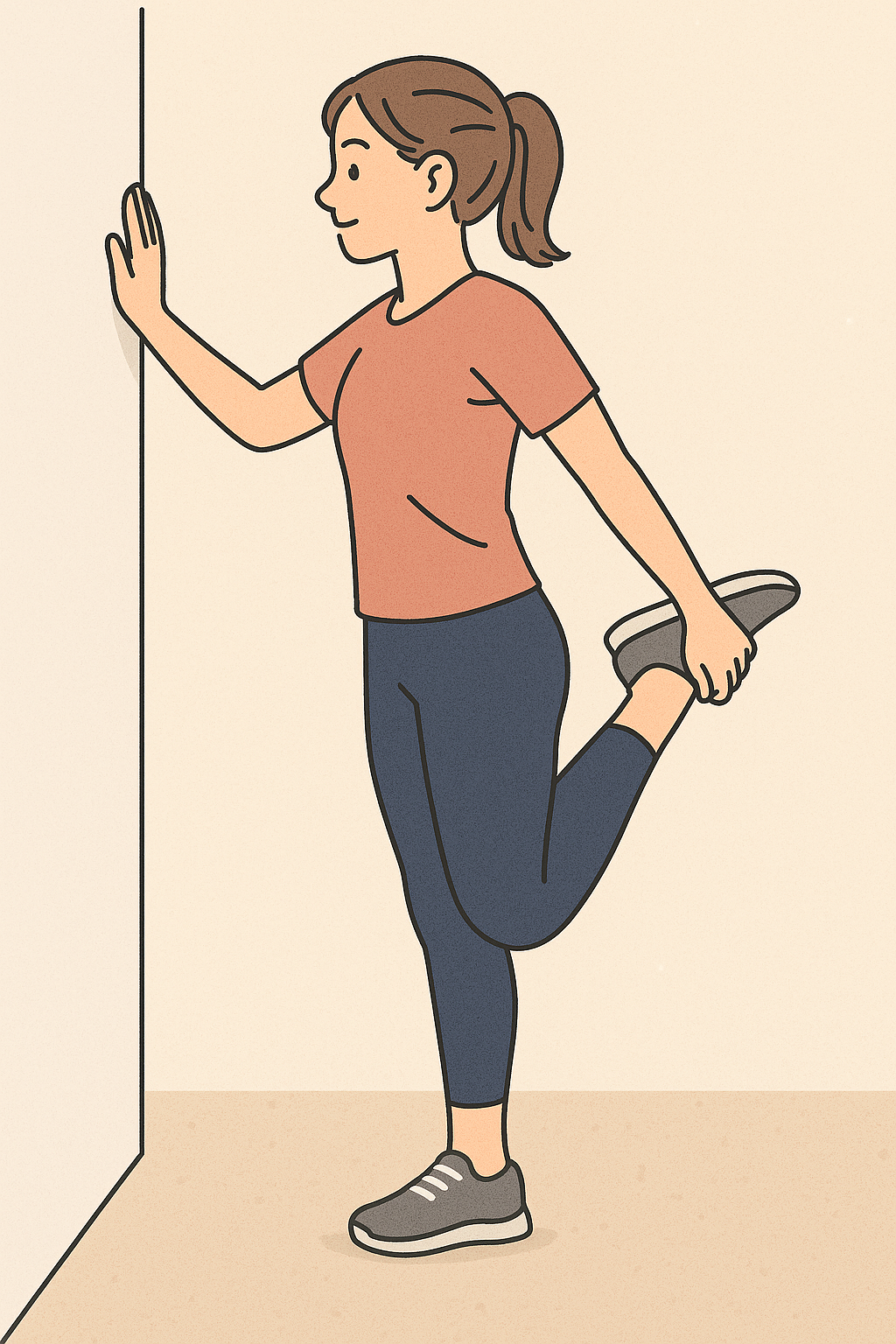 한 손으로 벽을 잡고 반대쪽 손으로 같은 쪽 발목을 잡아 뒤로 당깁니다. 무릎을 붙인 상태에서 엉덩이 쪽으로 당겨 30초 유지, 2세트 실시합니다.