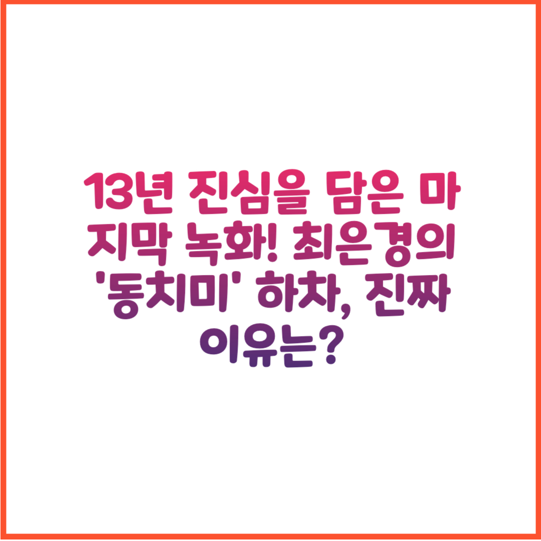 대한민국 중년 시청자들의 마음을 사로잡아온 MBN '속풀이쇼 동치미'의 상징과도 같았던 최은경 씨가 13년간의 여정을 마무리하고 하차 소식을 전했습니다. 갑작스러운 하차 통보와 별도의 작별 인사 없이 떠난 그녀의 선택은 많은 이들에게 아쉬움을 남겼지만, 그녀가 전한 진심 어린 소회는 오히려 묵직한 울림을 주고 있습니다. 이 글에서는 최은경 씨가 직접 밝힌 하차의 이유, 강제 하차 논란의 진실, 그리고 방송 뒤편에 숨겨진 그녀의 인간적인 면모까지 자세히 담아봤습니다. '동치미'를 사랑한 분들이라면 반드시 알아야 할 이야기입니다.