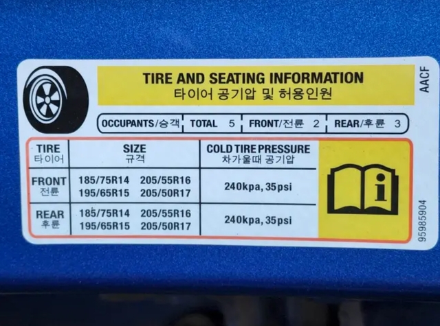스티커를 보면 “TIRE AND LOADING INFORMATION” 혹은 “Cold Tire Pressure”라고 써 있을 거예요.